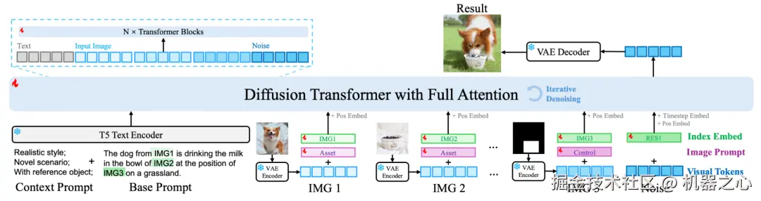 **模型结构:**我们借鉴了与 Sora 类似的视频生成架构,将不同的输入输出图像统一视作视频帧处理。具体来说,图像通过 VAE 编码后被转换为视觉 token,接着输入 Transformer 进行处理。与此同时,我们引入了 T5 text encoder 对输入指令进行编码,将生成的文本 token 与视觉 token 一同输入 Transformer。通过使用 full attention 机制,模型能够充分建模视觉和文本之间的关系,实现跨模态信息的高效融合和综合理解。这种设计确保了模型在处理多样化任务时的灵活性和生成效果的一致性。