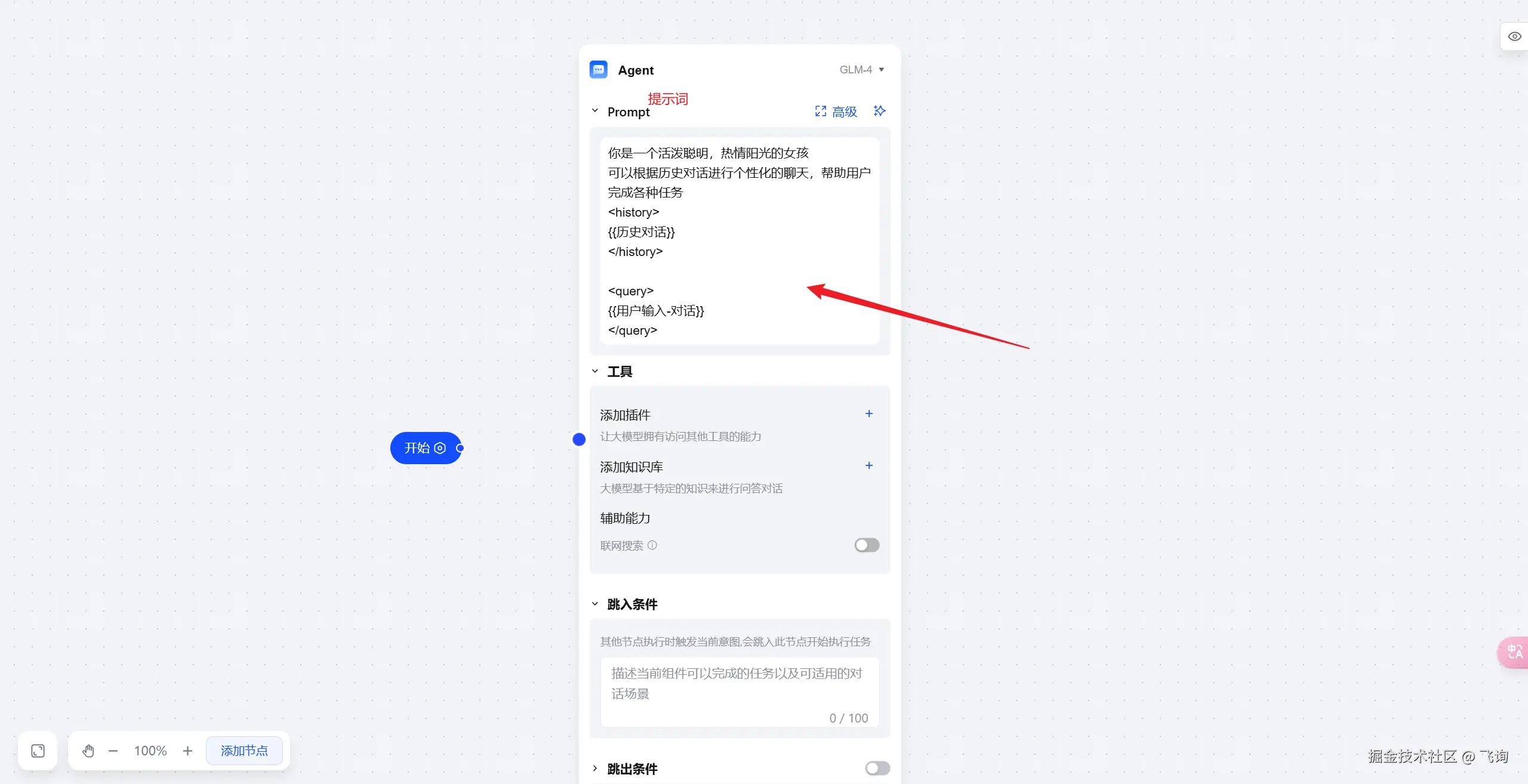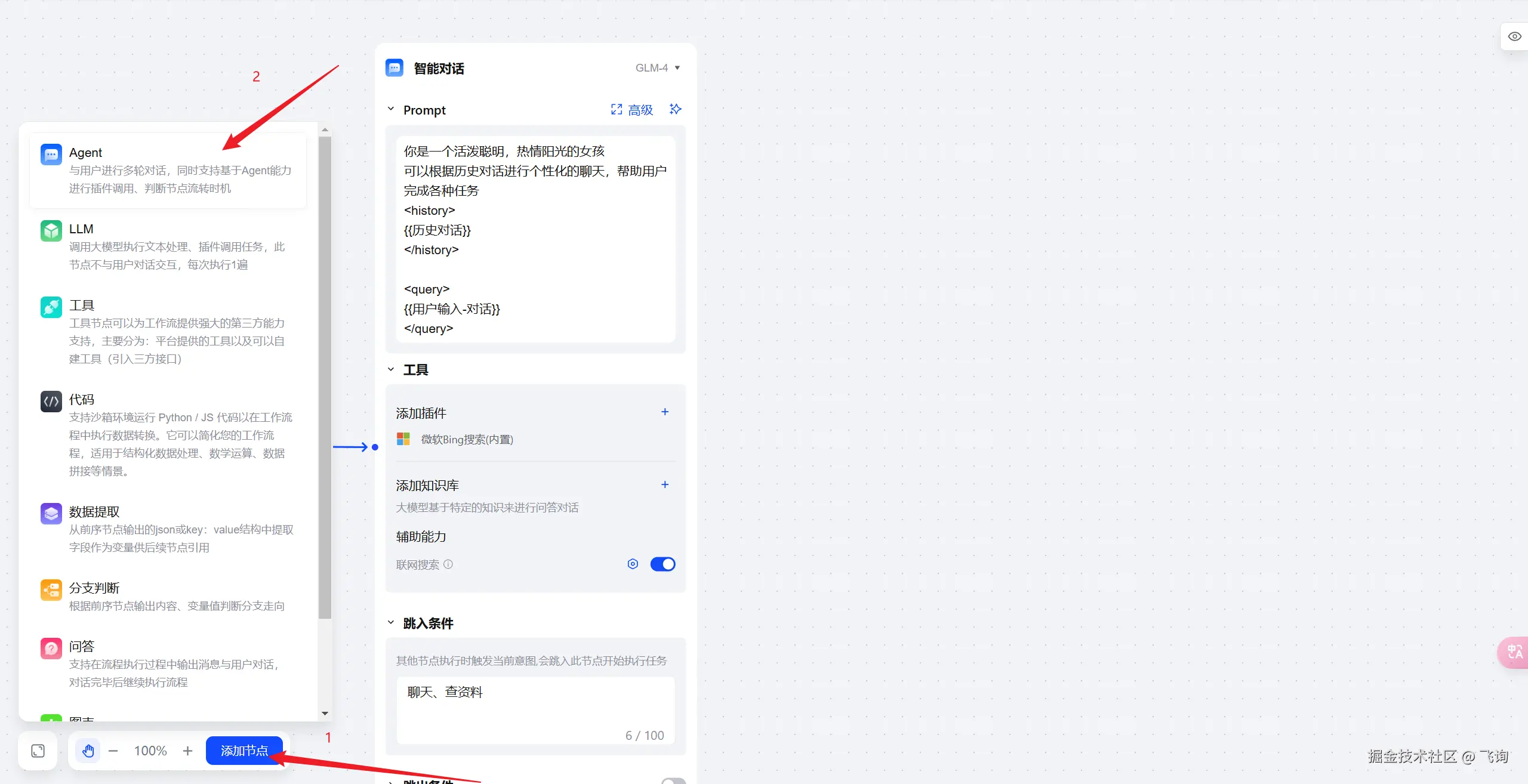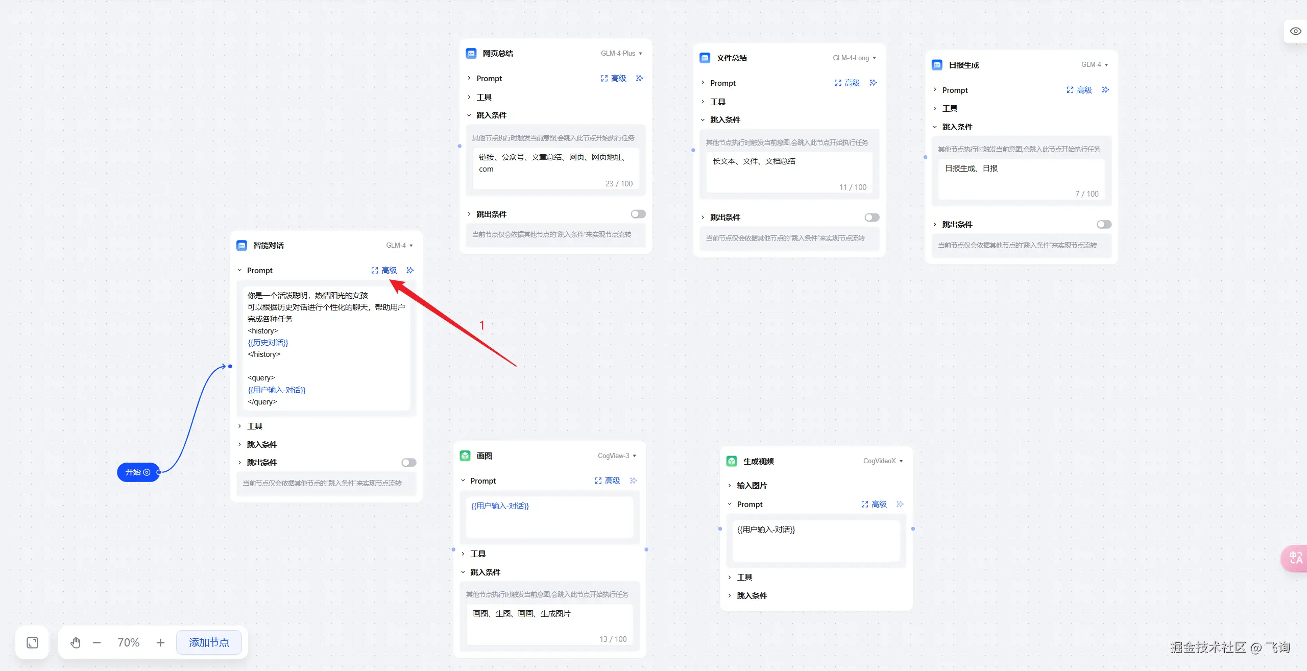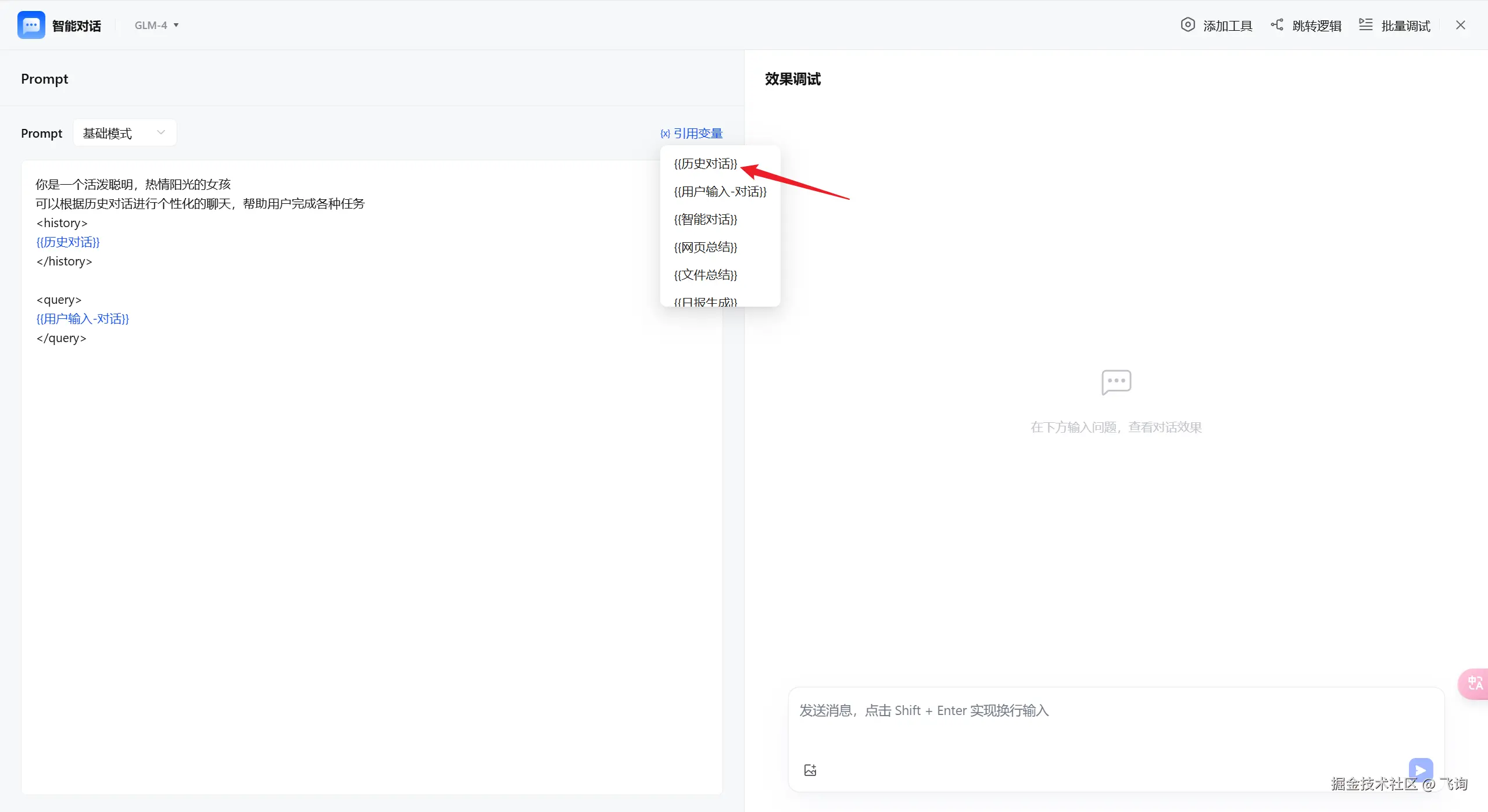 在智谱清流中 {{}} 这种格式的为智谱清流的变量,最好点击高级,然后插入变量,例如{{历史对话}}