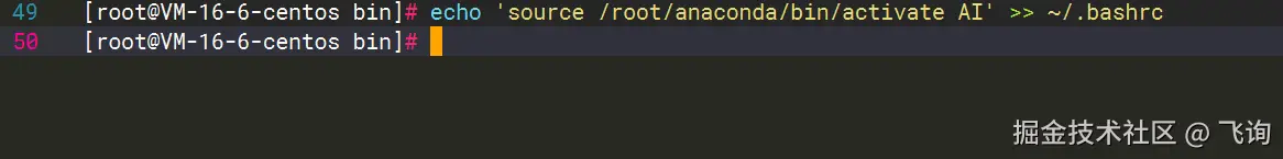 echo 'source /root/anaconda/bin/activate AI' >> ~/.bashrc