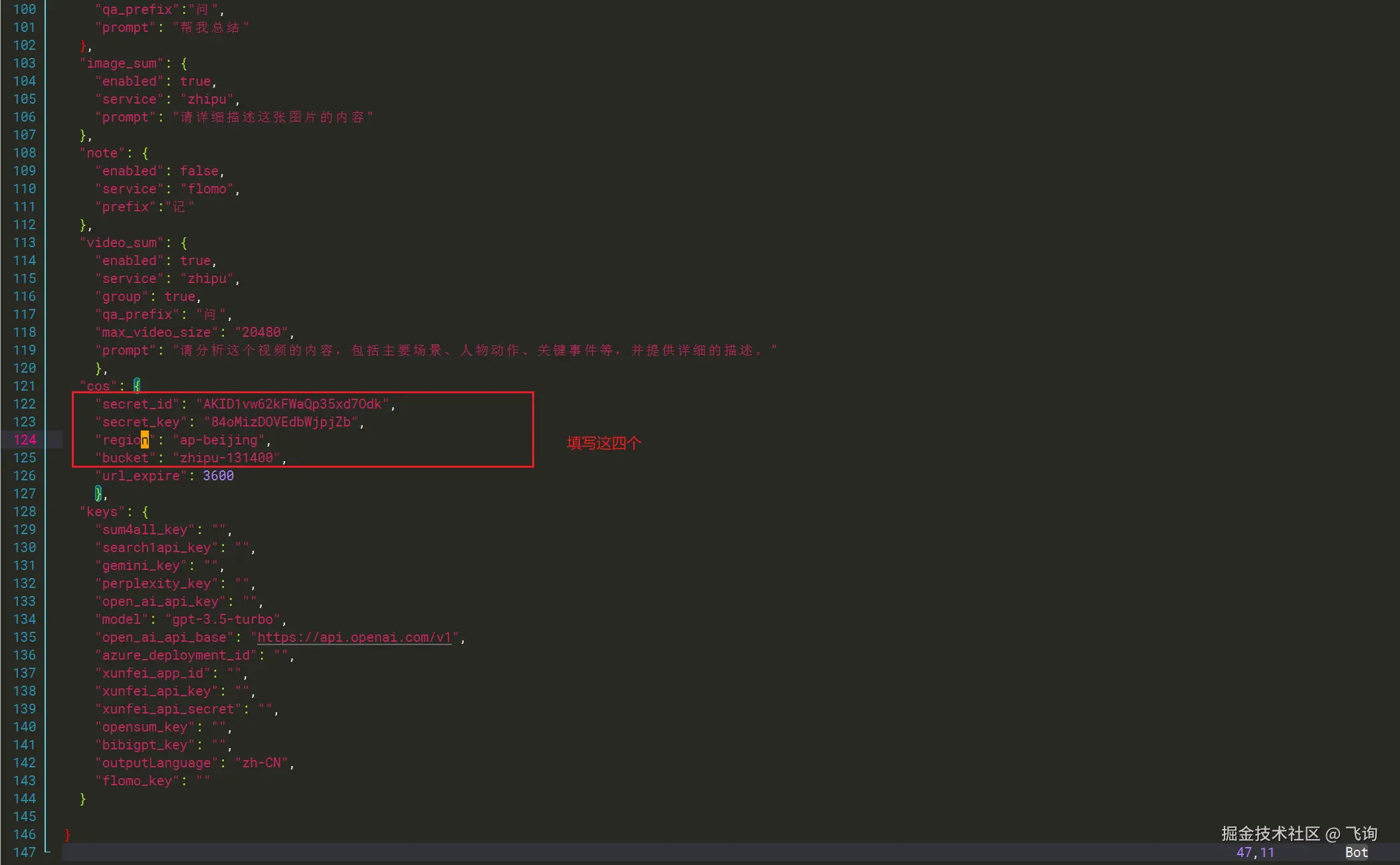 9)进入 COW-zhipu/plugins/sum4all 目录,编辑 config.json,录入你的腾讯COS的对应密钥