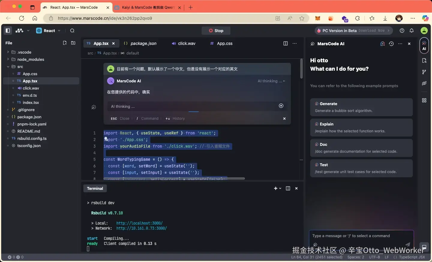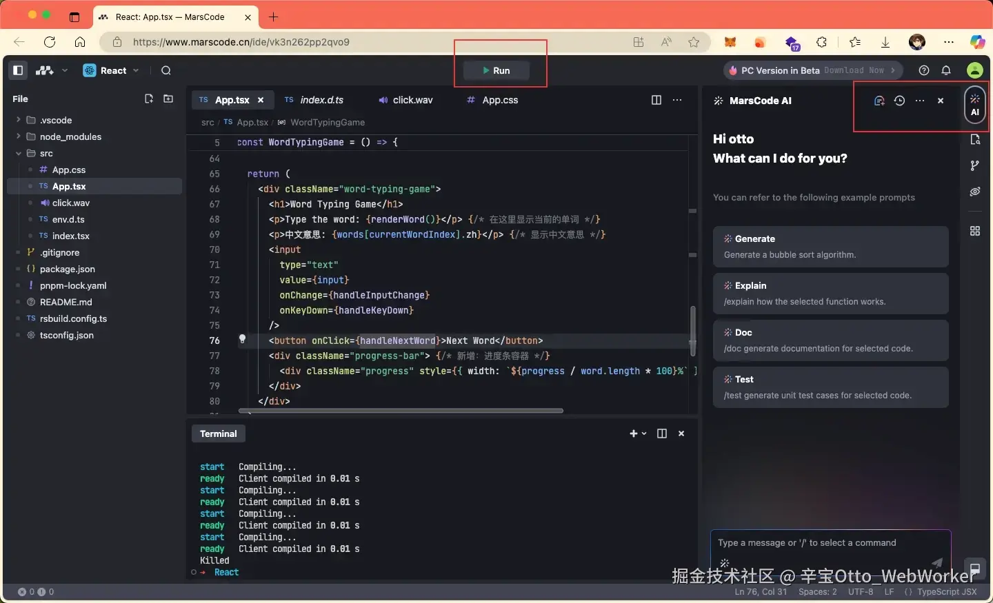 在 MarsCode 中选择 JS 框架 React,快速启动一个项目模版,几秒钟之后页面加载完成,依赖也安装完成,点一下顶部的 Run 就把默认的 rsbuild react 项目运行起来了。