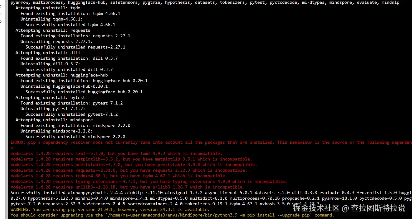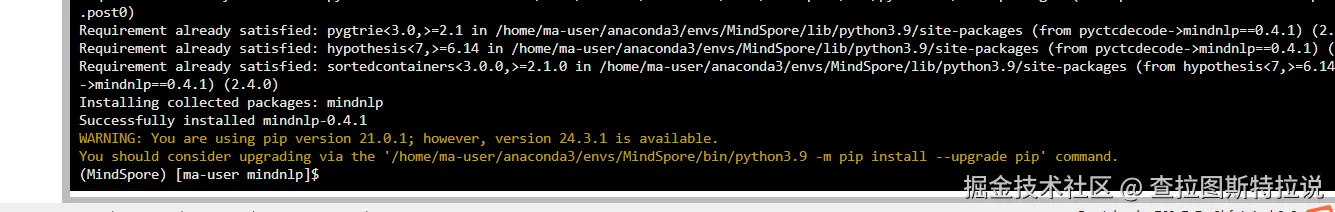 执行pip install mindnlp 会看到下面会有些版本冲突,不用理会