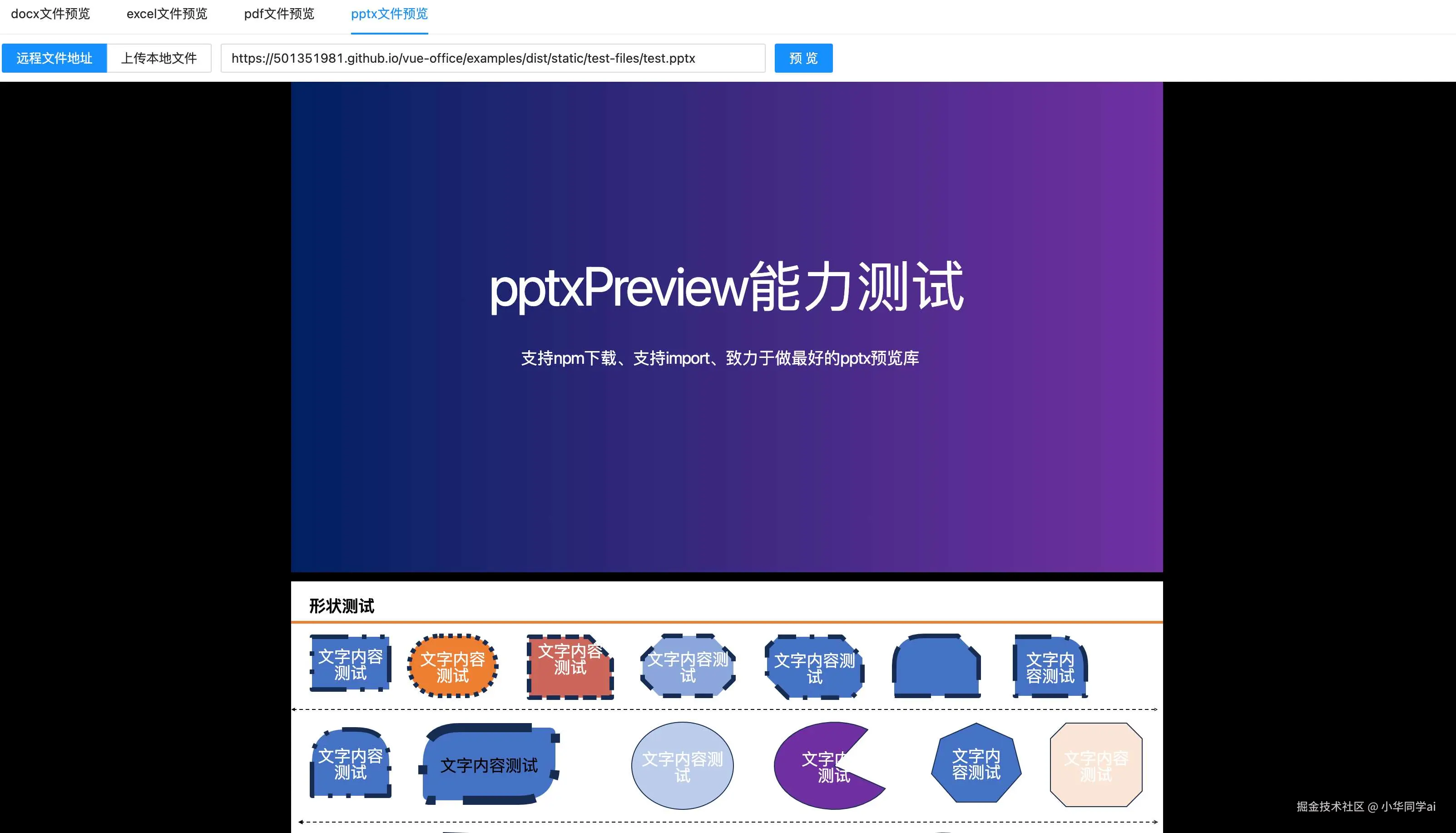 - pptx:基于自研库 pptx-preview 实现,源码单独付费向作者索取。