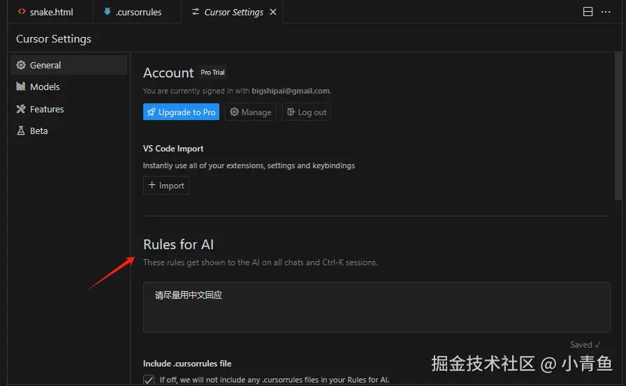 首先Cursor帮我们定义了绝大部分编程所需的Prompt,但是我们我们要知编程也分很多种我们可以使用python、java、c++、go等多个语言,每个语言中又 有很多框架,比如前端的vue、react等等。这些我们需要根据自己的情况和喜好,来进行自定义。