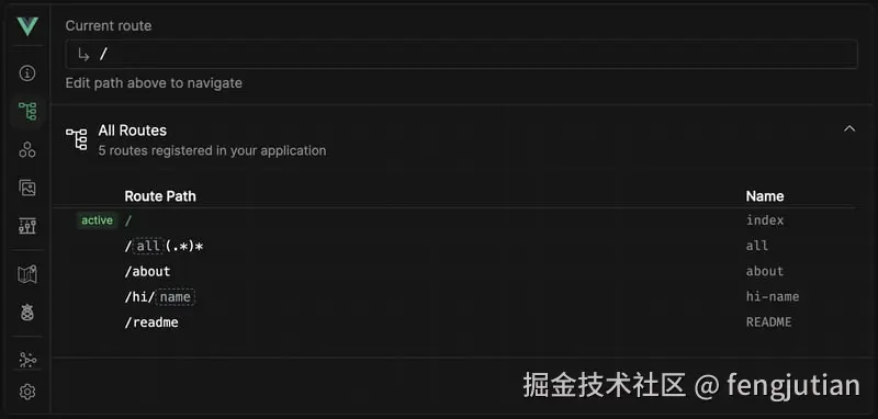 Routes选项卡是与Vue Router集成的功能,允许您查看已注册的路由及其详细信息。