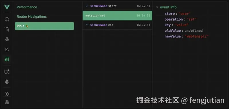 时间轴选项卡有三个类别:性能、路由器导航和Pinia。您可以在它们之间切换以查看状态更改和时间表。