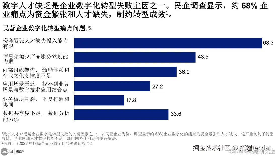 以民营企业为例,2022 年全国工商联经济服务部、国家发改委宏观经济研究院等对大陆地区民营企业进行问卷调查的结果表明,从转型投入及支撑保障方面来看,当下约 68% 的民营企业在数字化过程中的主要痛点为资金紧张与人才缺失,这极大地制约了数字化转型的成效。