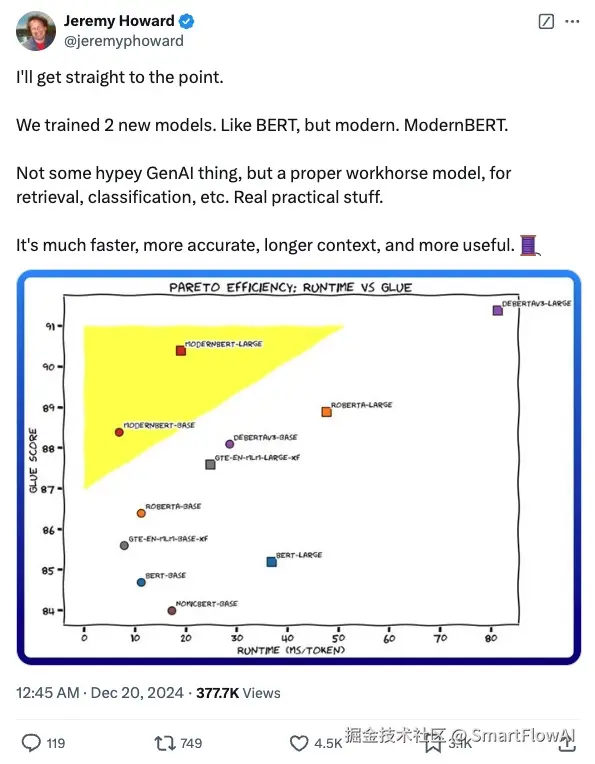 研究人员宣布训练出两个全新的ModernBERT模型,这是对经典BERT架构的现代化升级。根据公布的帕累托效率图显示,新模型在准确度和运行速度上都实现了显著提升,特别适用于检索和分类等实际应用场景。