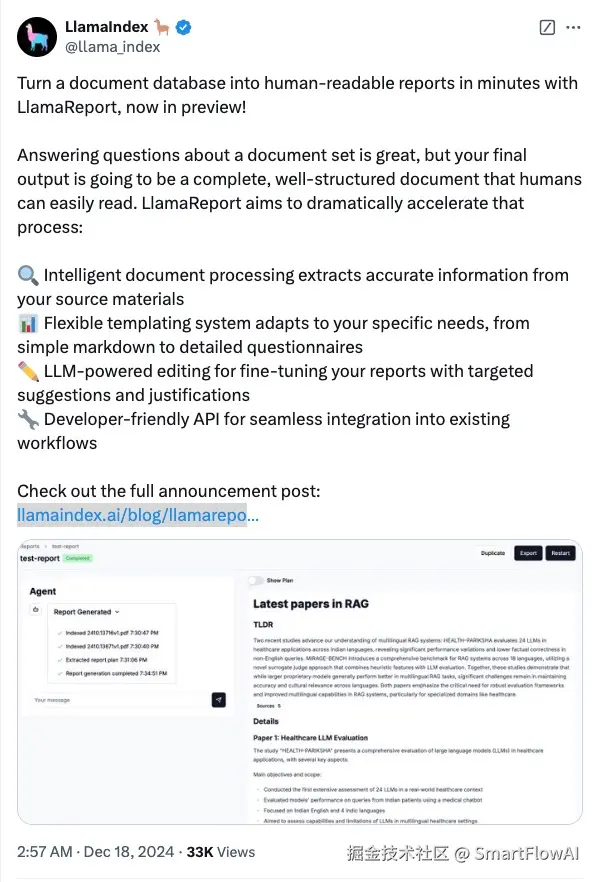 LlamaIndex团队推出全新工具LlamaReport预览版,该工具能够快速将文档数据库转化为结构化的可读报告。系统配备智能文档处理、灵活模板系统、LLM驱动的编辑功能以及开发者友好的API接口,可轻松集成到现有工作流程中。目前还是预览状态,并没有发布。