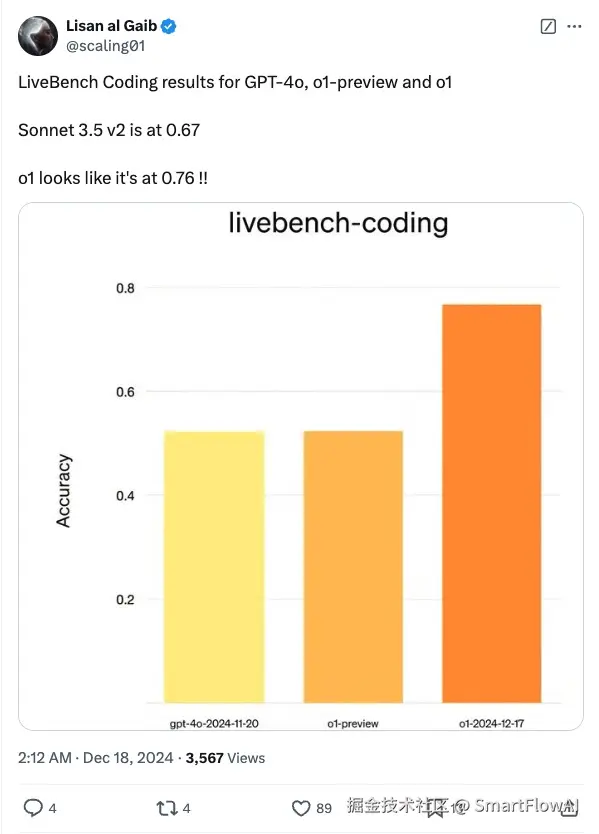 最新发布的LiveBench编程基准测试结果显示,OpenAI的o1模型在代码能力评估中取得显著突破,准确率达到0.76,大幅领先于GPT-4和o1-preview版本。相比之下,此前的标杆模型Sonnet 3.5 v2的准确率为0.67。