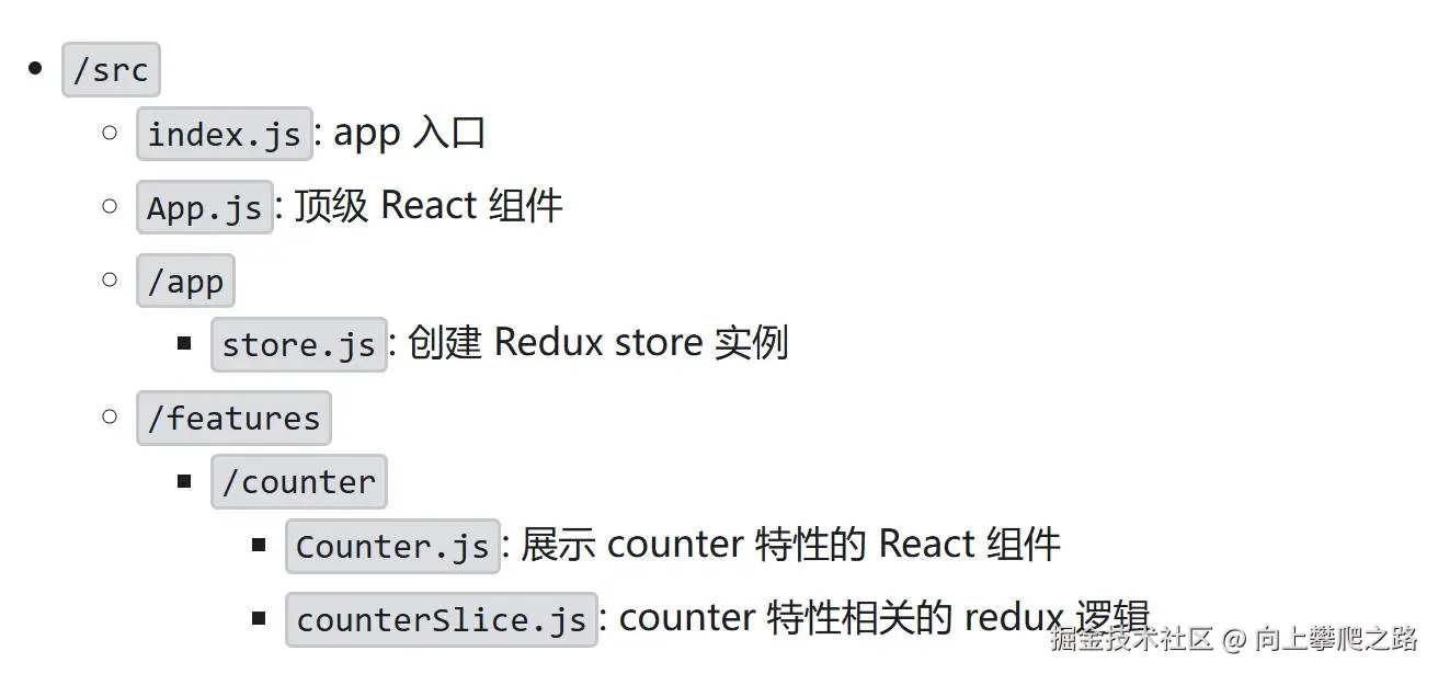 通常Redux会有一个规范的目录结构,/src/features/单个功能/功能对应的slice.js