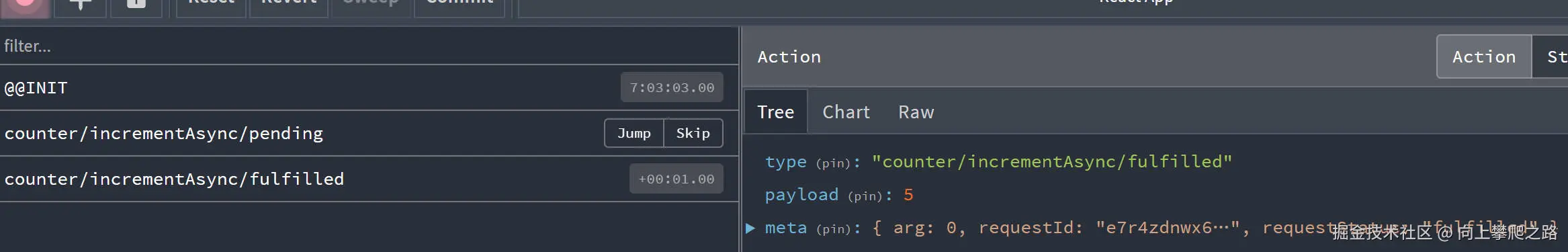 此前安装了浏览器插件Redux DevTools,按F12在工具栏中选择Redux,当dispatch分发的每个action都会被显示
