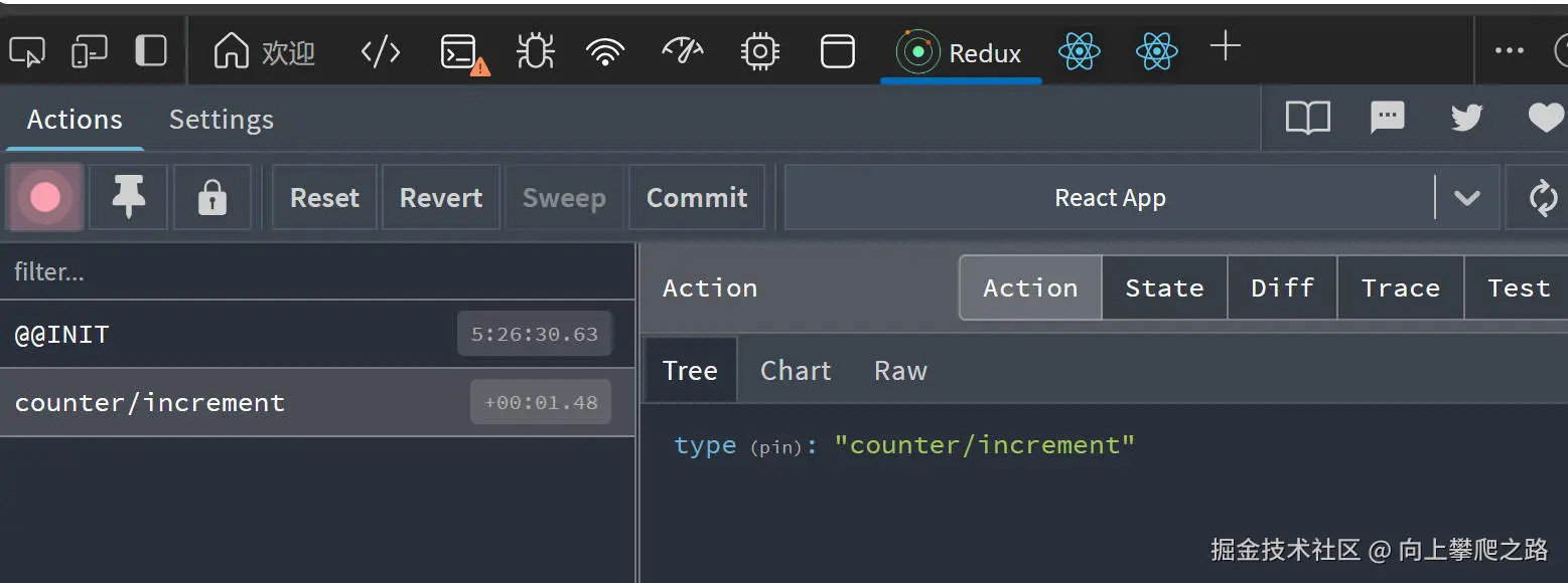 开发者工具栏中的 Redux