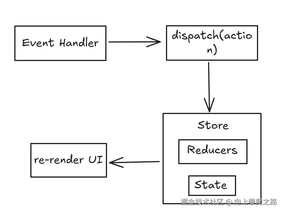 事件处理通过dispatch(分发-触发一个事件)一个action(动作-发生了什么事)到Store当中找到相应的Reducer(视为一个事件监听器),Reducer根据收到的action类型更新State,每个使用Store的组件将会重新渲染