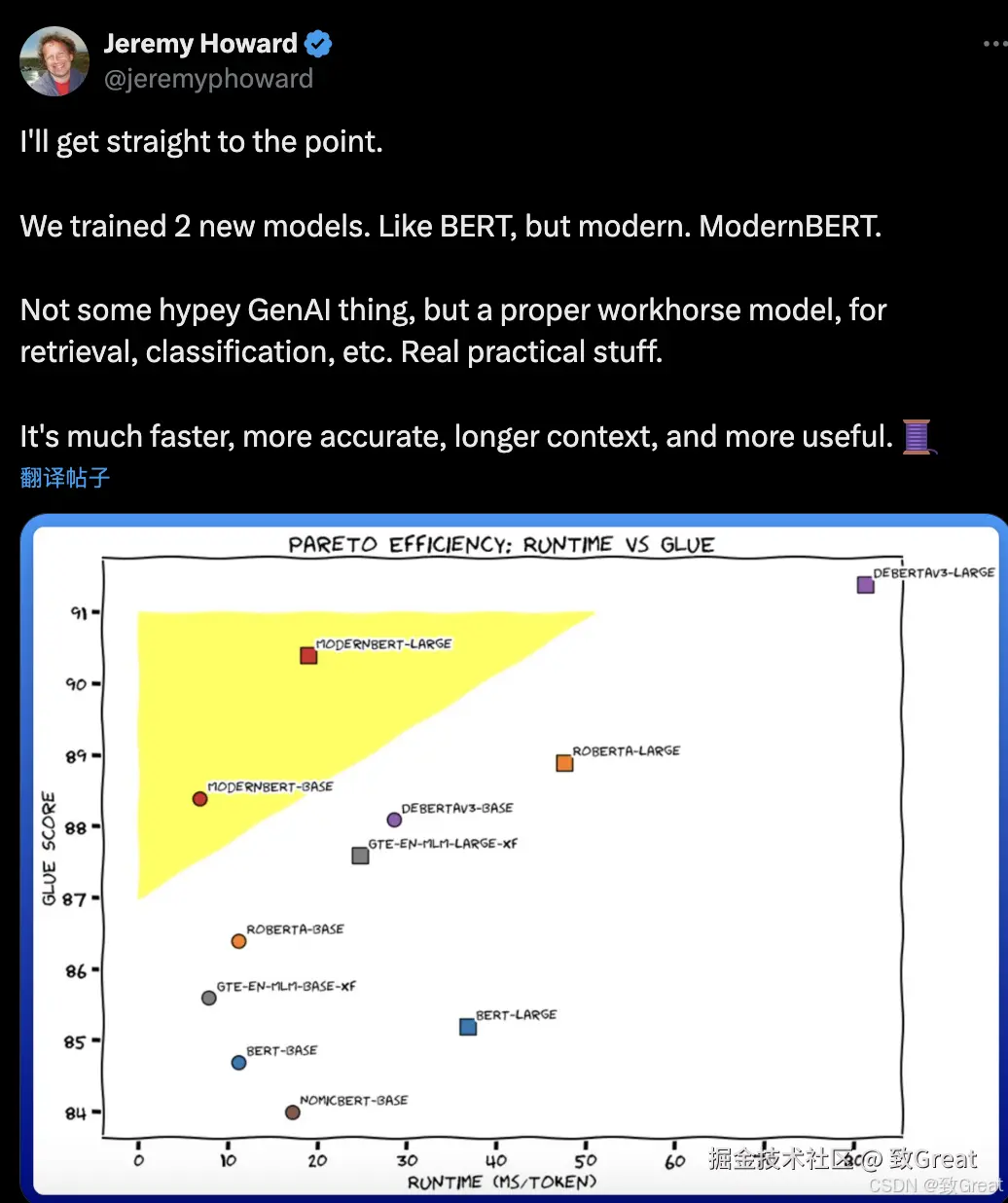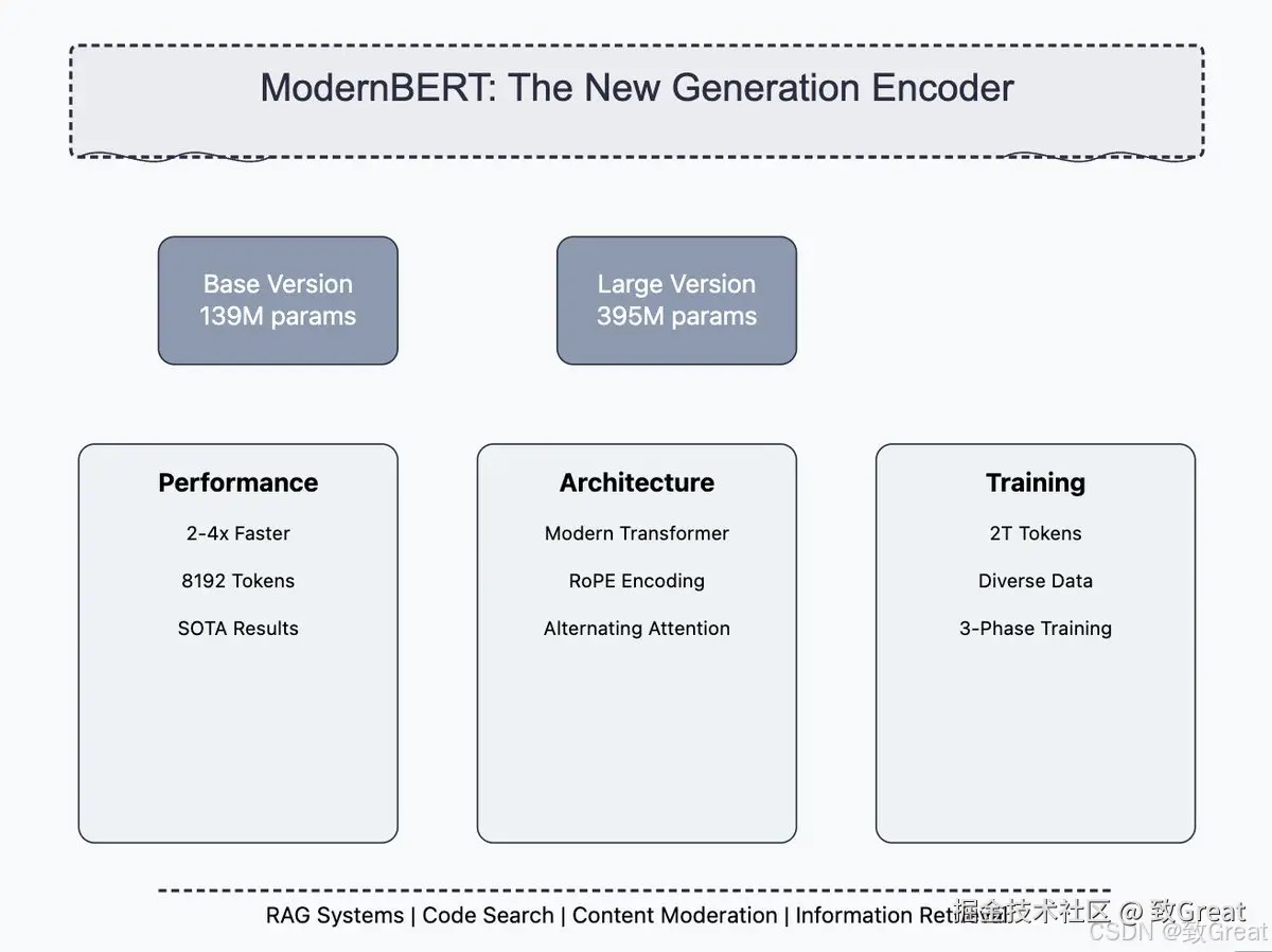 - 注重代码数据:ModernBERT 在训练数据中包含了大量的代码,使其在处理编程相关任务方面具有独特的优势。 改进的训练过程。