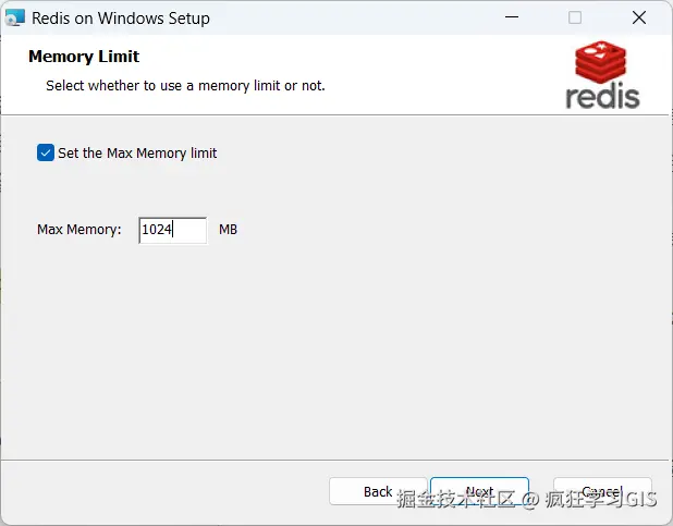 随后,是Redis最大内存的设置,如下图所示。一般情况下,这里就设置为机器内存的四分之三左右即可;当然也可以不设置,那么在64位的系统中,Redis就没有内存上限,而在32位的系统中,内存上限为3 GB。