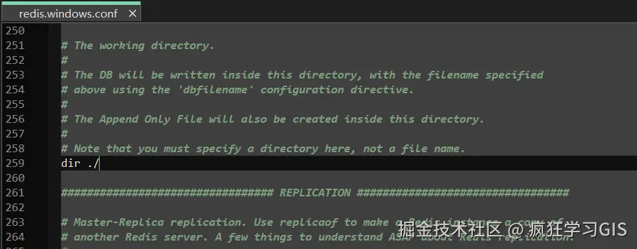 这个问题的解决方法也很简单。先按照前文所述的方法,关闭Redis服务,然后在除了C盘外的任意位置手动创建一个文件夹,复制这个文件夹的路径;随后用管理员身份的记事本打开redis.windows.conf这个文件,搜索dir ./字样,如下图所示。