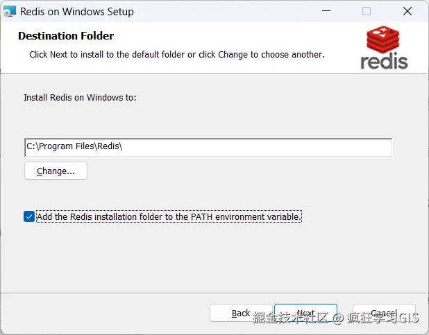 其中,有如下几个需要注意的环节。首先,需要配置一下Redis的安装路径,如下图所示。建议不要安装在C盘——倒不是说怕占据太多C盘的空间,而是因为在本地部署数据库等相关服务时,将程序放在C盘的话,后续可能会存在文件权限受限、服务运行异常等各类不可预料的问题。设置完毕后,需要记住这个安装路径,后续操作会用到。