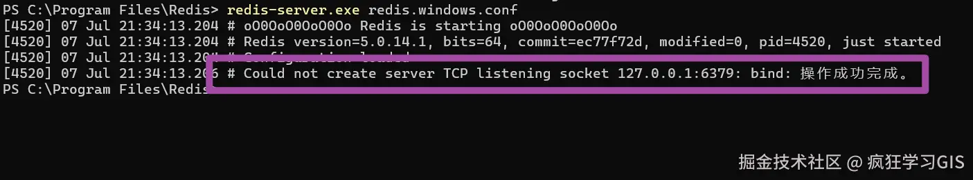 运行上述代码,一般情况下会出现如下图所示的错误,提示Could not create server TCP listening socket 127.0.0.1:6379: bind: 操作成功完成的错误。