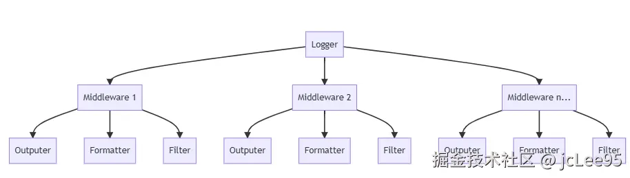 整个日志系统的核心是 Logger 类,它作为日志处理的入口点,管理着一系列中间件。每个中间件都可以包含自己的输出器、格式化器和过滤器,形成一个完整的日志处理单元。