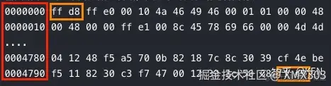 图中,红线框圈住的部分,是图片数据的字节流编址,可以看作是为了查看方便,添加的行号,红框右边的才是图片的真实存储字节流,并且每行显示 16 个字节。当然不管是“行号”还是图片数据,为了显示的简介性,默认都是用了十六进制。