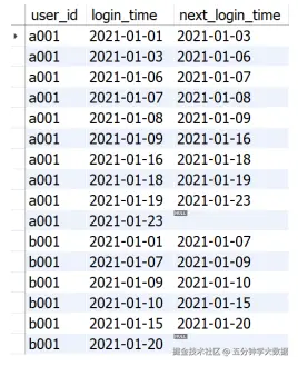 结果样例如下图所示。**可供参考的解题思路:**本题考查LEAD()函数在处理时间间隔问题上的使用方法,观察内层的查询部分,使用LEAD()函数在原有的login_time字段的基础上创造一列新的时间字段(即该用户下一次登录日期),内层查询代码如下:SELECT user_id
