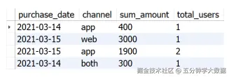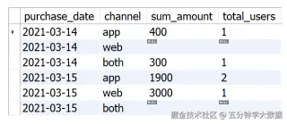 问题:查询每天仅使用手机端的用户、仅使用网页端的用户和同时使用网页端和手机端(both)的不同用户人数和总购物金额,并且即使某天某渠道没有用户的购买信息,也需要展示。**输出内容包括:**purchase_date(日期)channel(购买渠道)sum_amount(总购买金额)total_users(不同用户人数)结果样例如下图所示。**可供参考的解题思路:**根据用户ID和日期进行分组,通过统计用户在各购买渠道购物的记录个数来判断某用户在某日期购物时采用的访问方式(web、app和both)。其中,web和app可以通过一个SELECT语句查询,both则可以通过另一个SELECT语句查询。将两部分使用UNION连接在一起,并将以上部分作为子查询内部,在子查询外部统计不同购买日期、购买渠道的总购买金额和总购买用户。本部分SQL代码如下: