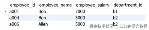 employee表的数据如下表所示。还有一张部门信息表department,表中包含如下两个字段。