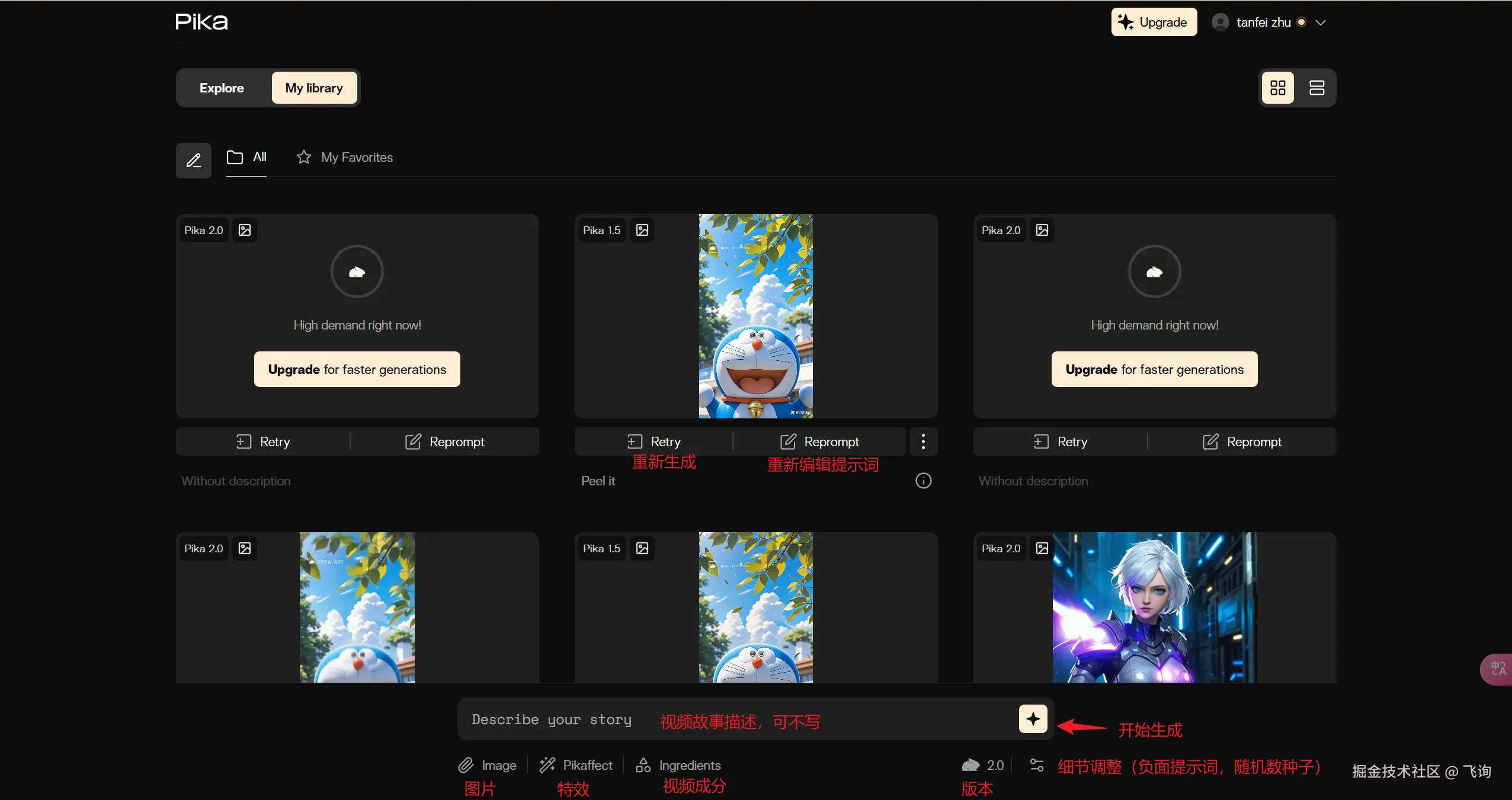 目前 pika 2.0 免费使用,不过免费的期限是 12月23日 的 下午4点左右,在没有订阅的情况下,生成速度大致十几分钟左右,并且 Pikaffect 这个在 pika 2.0 使用不了,只能是 pika 1.5 使用。