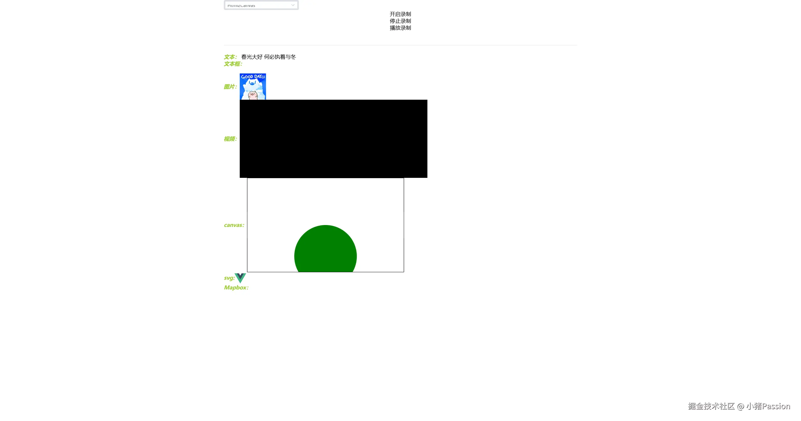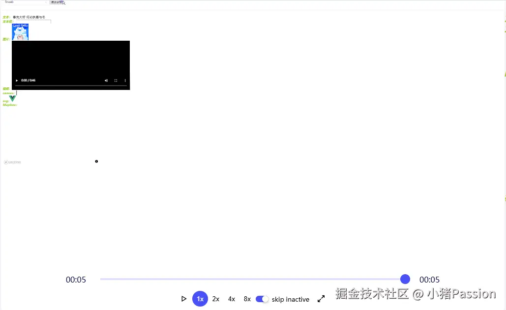 结合上述代码运行的效果可以看出,rrweb录制内容存储了完整的页面结构可以较好的还原整个页面的dom操作,并且录制过程具有较好的清晰度,也不会和html2canvas一样过分掉帧,具有较好的性能;并且rrweb的可操作性和可扩展性要更优秀,可将录制得到的json产物转换成视频、并支持多哥可扩展式插件等;可以看到上图左下角只显示了Mapbox的logo并没有记录地图瓦片,是因为Mapbox底层依靠WebGL进行地图渲染,而目前rrweb对WebGL的部分功能无法进行还原..