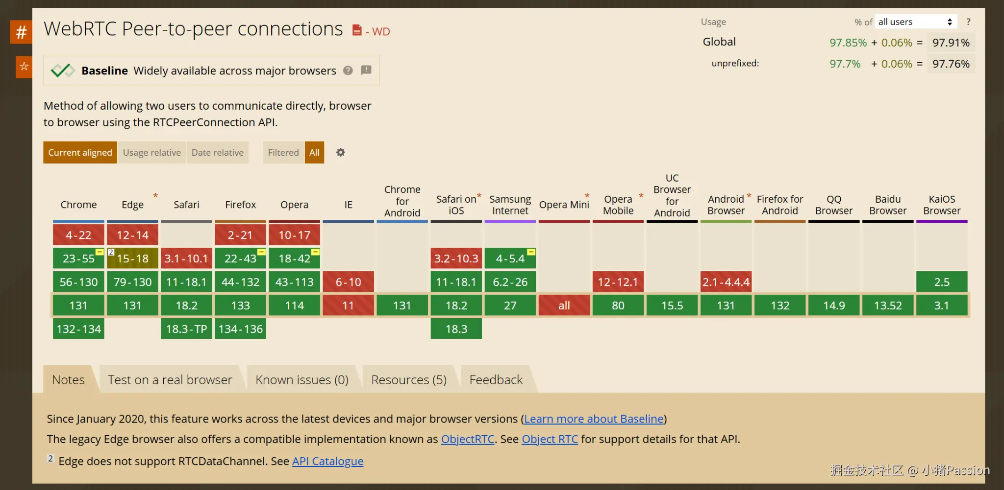 - WebRTC兼容性: WebRTC API针对不同浏览器,他的兼容性也各不相同API兼容性查询