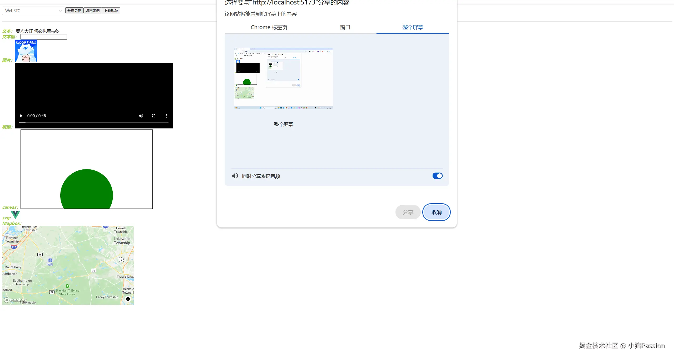 rrweb在各方面均比较优秀,但我们针对Mapbox开发的地理场景无法通过rrweb进行记录,最后不得不选择利用WebRTC API进录制,再利用FFmpeg进行数据格式的转化并导出。