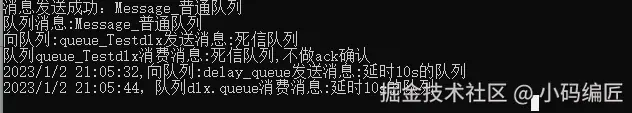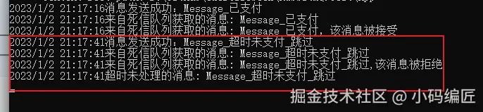Console.WriteLine($"{DateTime.Now},队列{dlxQueueName}消费消息:{message}");