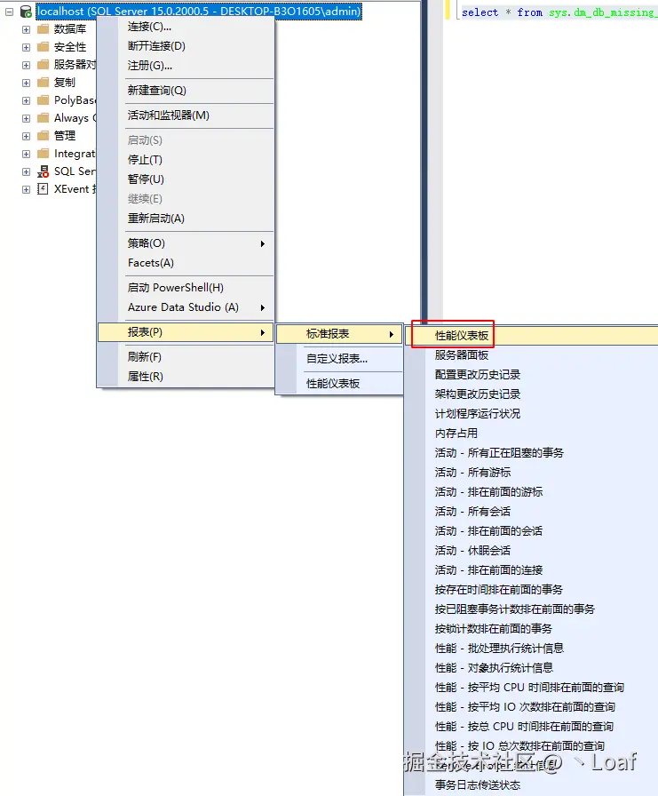 SSMS提供了性能仪表盘,打开方式如下: