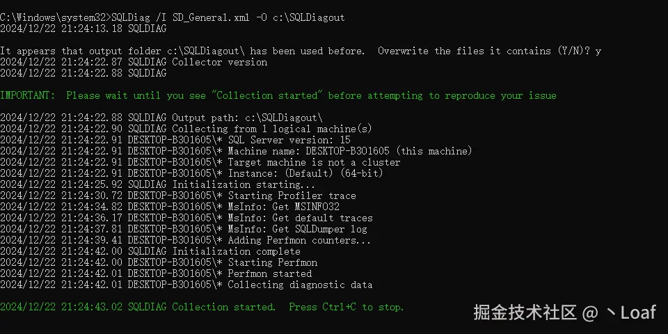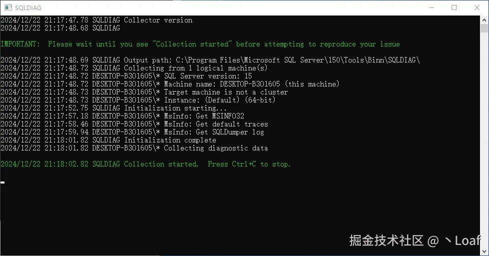首次运行会出现这个界面,当出现“SQLDIAG Collection started. Press Ctrl+C to stop”信息以后,就按Ctrl+C组合键,终止这个工具的执行。SQLDiag工具会在Binn目录下产生三个XML文件,并且产生一个SQLDIAG子目录,存放刚才收集的信息