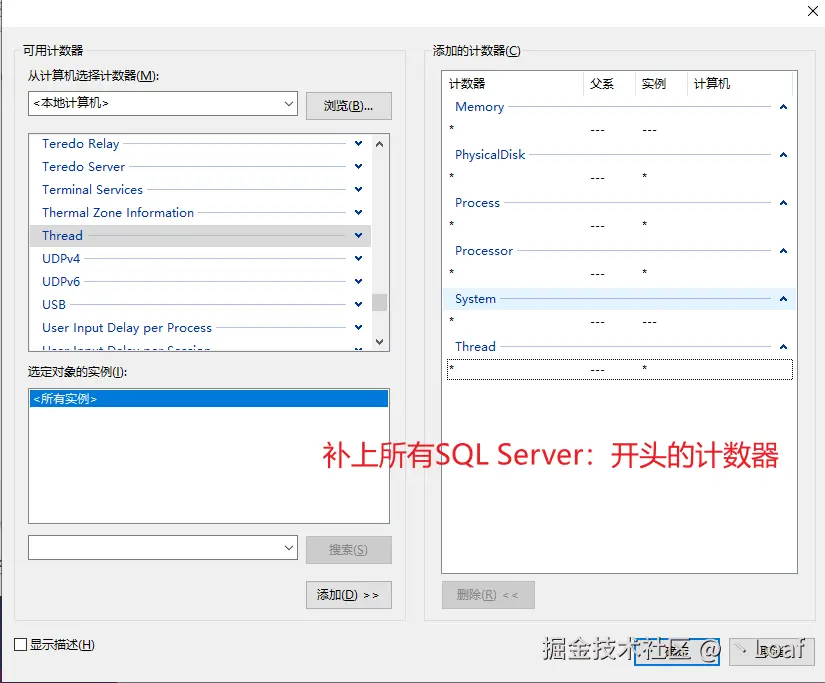- 如果要监视CPU类问题,最好还包含“Thread”下面的所有计数器,以及它所有的instance。