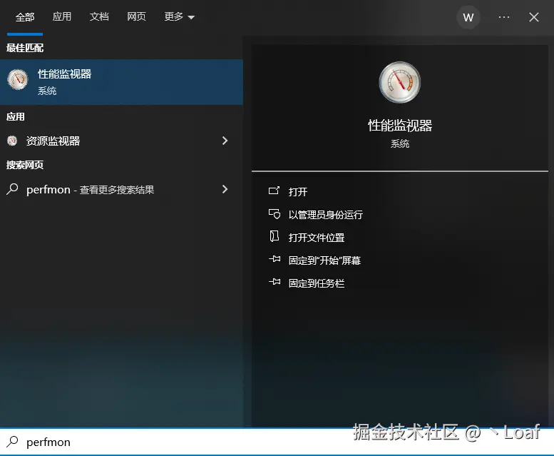 按win键,输入perfmon,回车打开性能监视器