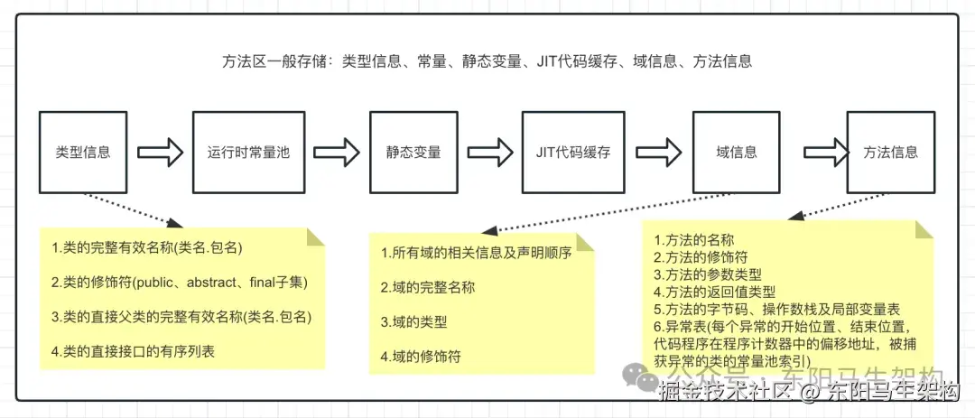 方法区主要存放:类信息、常量、静态变量和JIT编译后的代码缓存等。在JVM启动的时候,方法区就被创建为固定大小或可动态扩容的区域。方法区在逻辑上属于堆的一部分,但一些简单的实现不会进行GC回收。因而方法区可看作是独立于Java堆的一块空间。