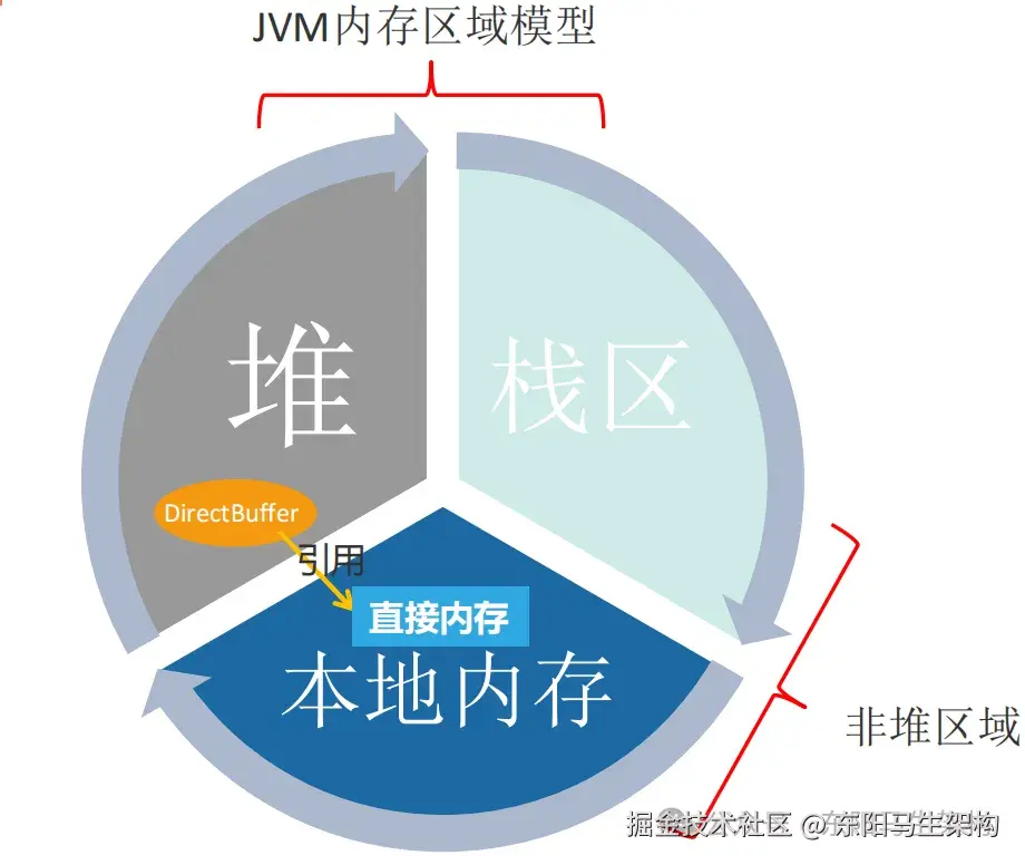 在JDK1.4中新加入了NIO(New Input/Output)类,引入了一种基于通道(Channel)与缓冲区(Buffer)的I/O方式,它可以使用native函数库直接分配直接内存(也可以说是堆外内存),然后通过一个存储在Java堆中的DirectByteBuffer对象来操作其数据,这能在一些场景中提高性能,避免在Java堆和Native堆中来回复制数据。其中这个DirectByteBuffer对象其实可以看成是直接内存的引用。