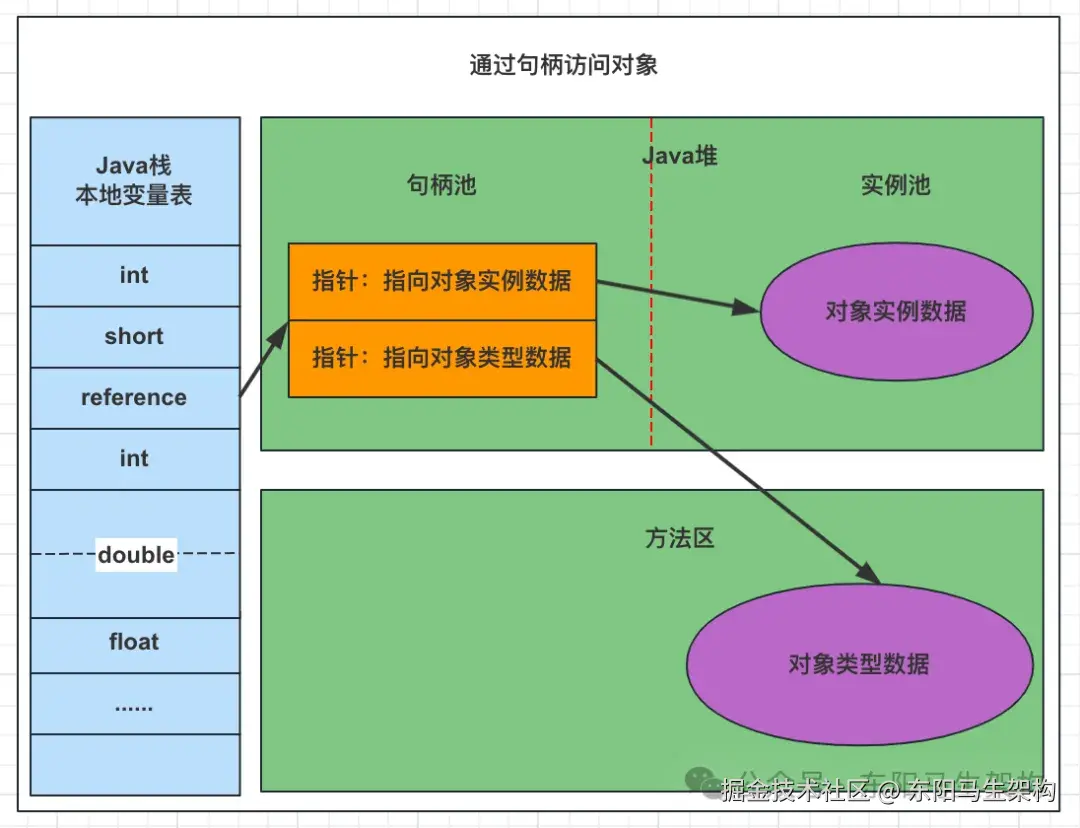 如果使用句柄访问,那么Java堆中将会划分出一块内存来作为句柄池。reference中存储的就是对象的句柄地址,句柄中包含了对象实例数据与类型数据各自的具体地址信息。