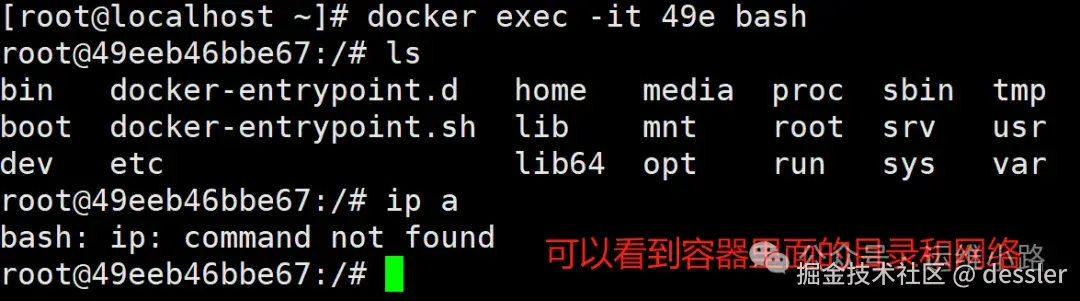 docker exec : 进入容器或者在容器中执行命令,这个操作就等于通过ssh或者控制台进入到容器内部,可以看到里面的文件和网络情况,但是容器里面都是裁剪得比较厉害,好多命令都是没有的。