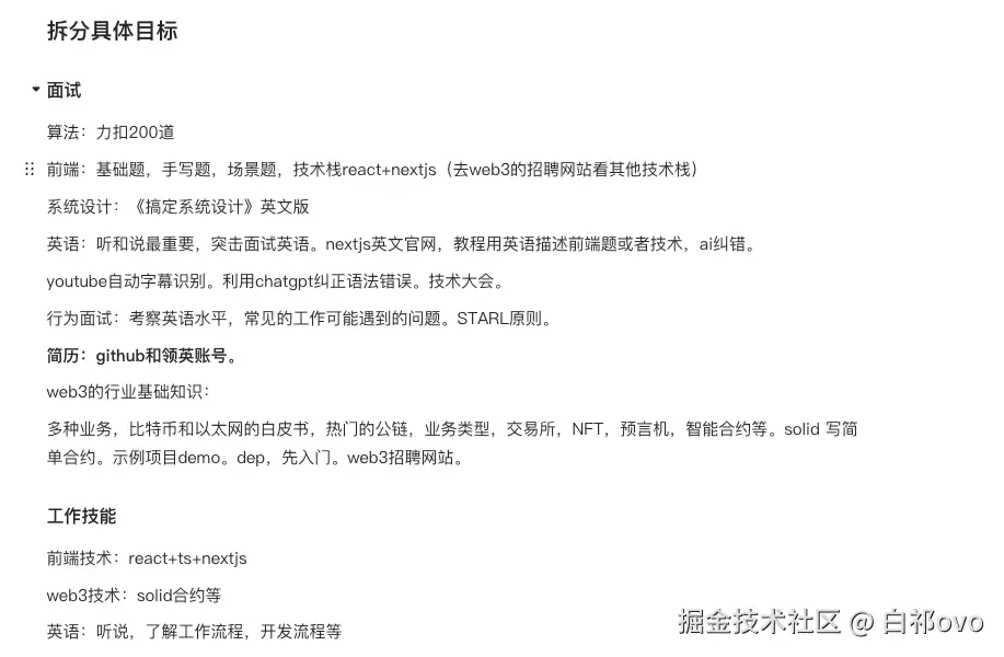 但中短期目标已经确定,方向定了,剩下的就是努力了,根据找工作的目标,去招聘网站上找对应的岗位能力描述,根据描述拆分岗位需要的能力,然后根据能力去制定目标,然后进行实践。这个过程的方法论就很多了,我就不多赘述了,直接上图。