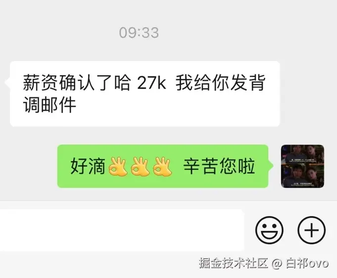 这次跳槽也是基本上达成了自己的目标,Hr给我说是双休,工作日一般18:30-19:30下班,一个月可能有一天的周六要来加一下班,这个工作强度对比上一家还是轻松了不少。并且这家是React技术栈,基建和开发流程也比上家相对规范。薪资也是达到了预期的涨幅。