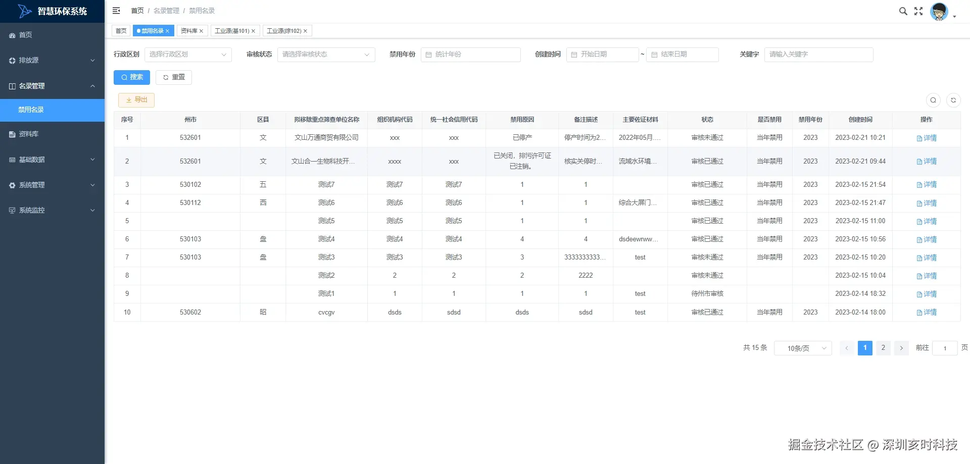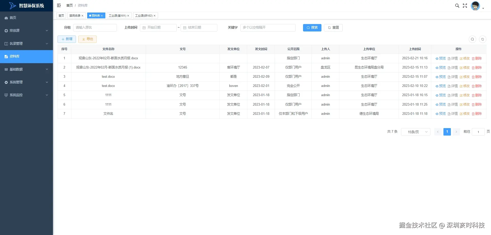 排放源 工业源(基101):管理工业排放源的基础数据,如排放量、排放标准等数据。 工业源(综102):管理工业排放源的综合数据,包括排放分析、趋势预测和改进措施。 污水处理厂(基401):记录污水处理厂的基础操作数据,如处理量、水质参数和处理效率。 污水处理厂(综401):分析污水处理厂的综合数据,包括成本效益分析和优化建议。 垃圾处理厂(基402):管理垃圾处理厂的基础数据,如垃圾量、处理方法和环境影响。 垃圾处理厂(综403):分析垃圾处理厂的综合数据,包括处理效率、成本控制和改进措施。 危险固废处置厂(基403):记录危险固废处置厂的基础数据,如处理量、处置方法和安全标准。 排放源管理 统计分析:进行工业源变化统计,分析污染物种类、排放量和变化趋势。 污水处理厂变化统计:统计和分析污水处理厂处理能力、效率和水质变化情况。 名录管理 禁用名录:管理禁用物质活动的名录,包括禁用原因、时间和相关法规。 资料库:集中存储和管理各类环境数据和信息,支持环境监测、分析和决策。 基础数据 行政区划:维护行政区划信息,包括区域边界、地理编码和行政单位。 河流:记录和管理相关的数据,如河流水质、流量和流域特征。 湖库:管理湖泊和水库的数据,包括水质监测、蓄水量和生态状况。 系统管理 用户管理:负责系统中用户账户的创建、编辑、权限分配和状态管理。 角色管理:定义系统中的用户角色,并分配相应的权限和访问控制。 菜单管理:配置和维护系统菜单项,定制用户界面和导航结构。 部门管理:管理组织结构中的部门信息,包括部门设置和部门成员。 岗位管理:定义和管理组织中的岗位信息,包括岗位名称、职责描述和岗位要求。 通知公告:发布和管理系统通知公告,确保信息及时传达给所有用户。 导入文件:允许用户导入数据文件到系统,用于数据迁移和批量处理。 日志管理 操作日志:记录用户在系统中的操作历史,便于审计和问题追踪。 登录日志:记录用户的登录活动,包括登录时间、IP地址和登录状态。 系统监控 在线用户:实时显示当前在线的用户列表,包括登录时间、活动状态和用户操作记录。