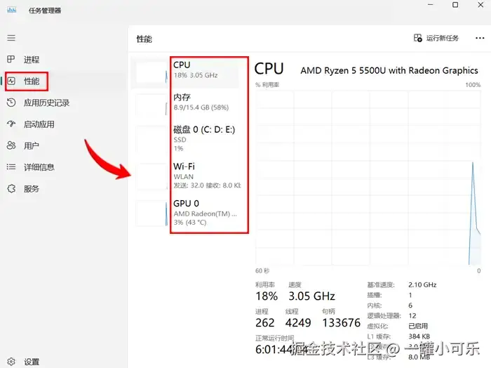 在任务管理中也可以解决如何查看电脑配置的问题。右击任务栏底部,选择【任务管理器】,点击【性能】 选项即可查看有关电脑的运行配置,如CPU、内存、磁盘等配置参数。