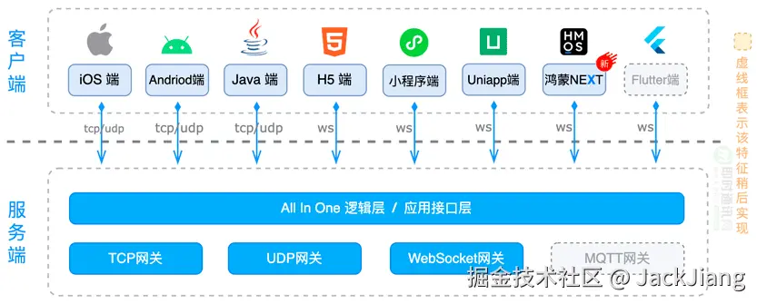 - 10) 多端协议兼容:实现了与MobileIMSDK各种客户端完全兼容的协议模型。