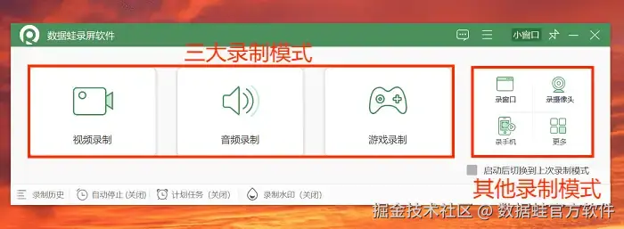 步骤1: 首先打开数据 蛙录屏软件,打开软件后我们就能够看到多种录制模式可以选择,按照个人需求选择就可以了。本文以 “视频录制” 为例。