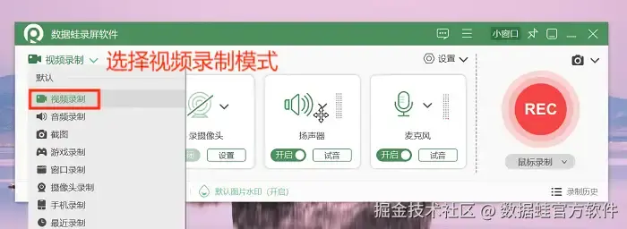 步骤1: 点击进入数据 蛙录屏软件,在主页面上找到录制模式选择的选项,根据个人需求选择就好了。本文以 “视频录制” 为例。