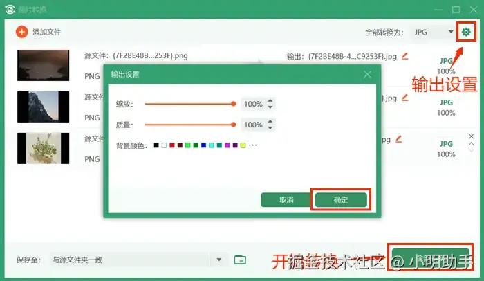 第三步: 如果想要压缩图片体积以方便传输、存储的话,可以点击右上角的绿色齿轮图标,进行缩放比例、图片输出质量等输出设置。