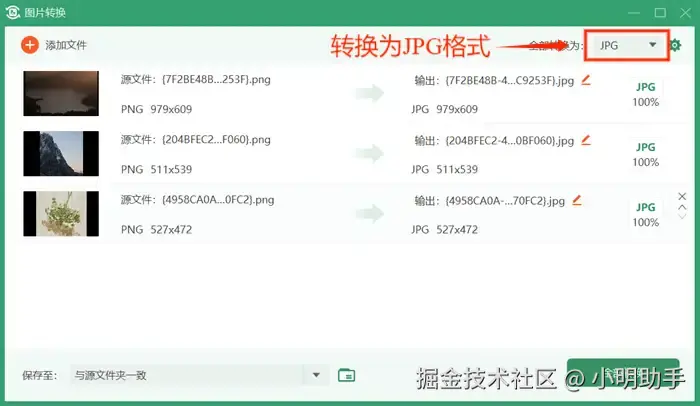 第二步: 点击右上角的格式选择框将图片的输出格式全部设置为JPG格式。